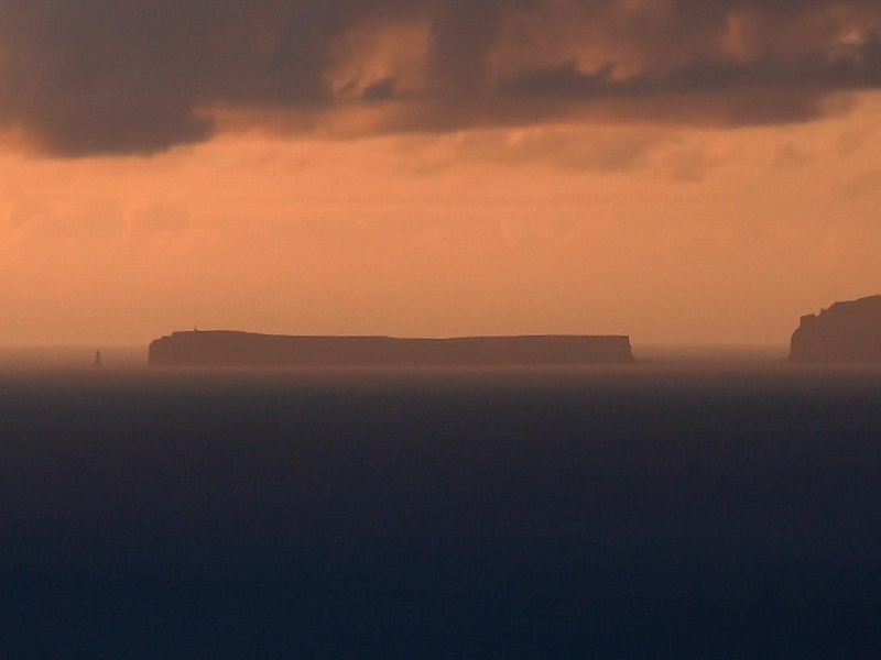 View in southern direction across the eastern part of Madeira towards the Ilhas Desertas which are legally protected. Ilhas Desertas at sunrise at a distance of about 25 km.