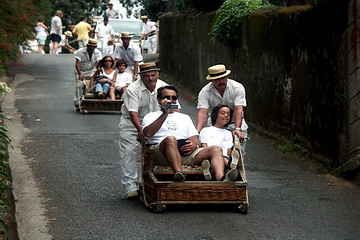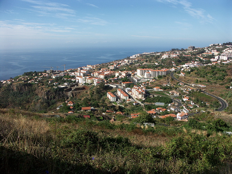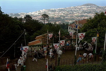The south coast is more arid than the northern part. The plane passes the airport along the coastline and then turns back down to the runway which is mainly built on concrete pillars. Monte is a part of the capital Funchal which is situated 600 m above the town. It is famous for its church called Nossa Senhora do Monte and the grave of the Austrian emperor Karl I. While the city was lying in bright sunlight El Monte was still wrapped in clouds.
