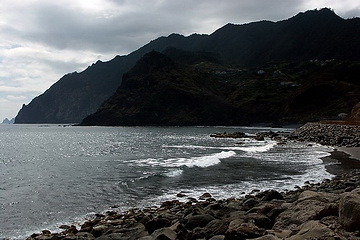 Am Strand von Porto da Cruz auf der Nordseite von Madeira. Die Berge ragen hier bis zu 740 m aus dem Meer. Sandstrände sind hier nicht zu finden.