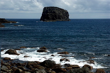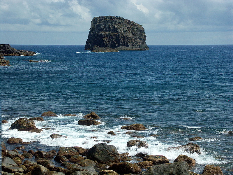 The beach of Porto da Cruz on the northern coast of Madeira. The mountains rise up to 740 m straight from sea-level. Felsen vor Porto da Cruz. Rock near Porto da Cruz. In this area sandy beaches cannot be found.