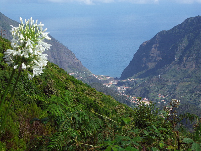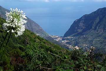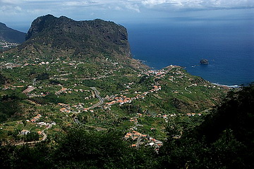 Porto da Cruz seen from Portela Pass (600 m), with the eagles' rock (Penha de Aguia - 590 m) to the left. The road below is reinforced, partly financed by the EEC. Although one could also use the tunnel we recommend the route via Portela. Another tunnel is connecting Sao Vicente on the north coast with the motorway in the south. It is however much more impressive to take the road across the Boca de Encumeada Pass (1007 m). The picture shows Sao Vicente seen from the pass.