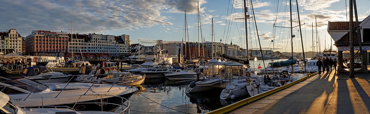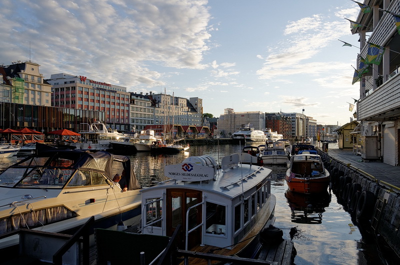 As in previous years we started our round-trip through Fjord Norway 2014 in Bergen, the second largest town in Norway. Considering the fact that Bergen is supposed to have more than 200 rainy days with an average annual precipitation of about 2.500 mm we were very kucky again as the weather turned out to be much better than expected. Although we arrived quite late at Flesland airport there was enough time to enjoy the long summer evening (sunset at 11:13 p.m.).