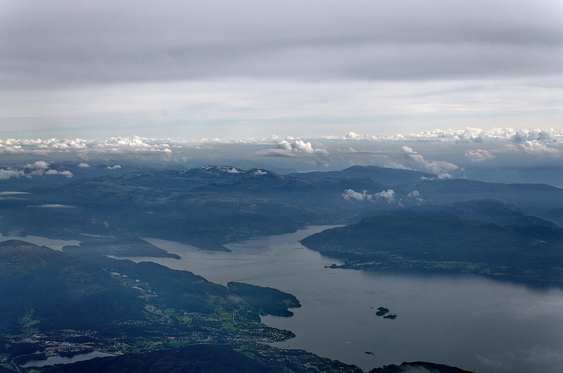 Kurz vor der Landung in Bergen-Flesland erahnt man schon die Großartigkeit einer von Wasser, Fels und Eis geformten Landschaft.