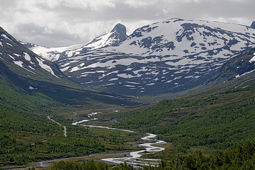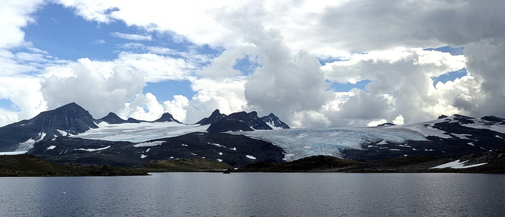 Lake Prestesteinsvatnet on top of the Sognefjell pass. From left to right Styggedalstindane (2.351 m), Fanaråki (2.068 m - center) with Fanaråkbreen and finally Steindalsnosi (2.025 m) to the right.