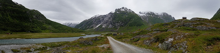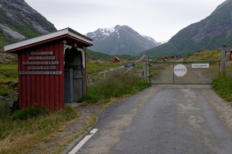 Kurz nach der Ortschaft Veitastrond kommt eine Mautstation, wo man die Mautgebühr für die restlichen 4 km bis zum Parkplatz bei Tungestølen in einen Umschlag steckt. Bei besserem Wetter lassen sich von hier aus schöne Wanderungen ins Langedalen oder in das rechts davon liegende Austerdalen unternehmen.