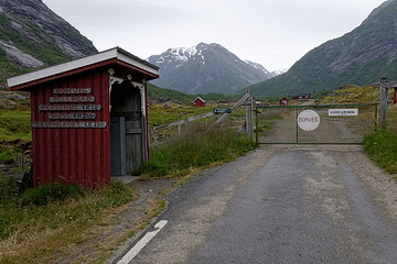 The gate just behind the village of Veitastrond is indicating another toll-road leading to a place called Tungestølen (4 km) which is payed by putting the money into an envelope. From the parking at the end of the road nice hikes are leading into the valleys of Langedalen and Austerdalen.