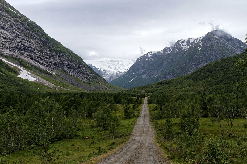 Blick auf den Bergsetbreen vom Parkplatz am Ende der Straße von Gjerde ins Krundalen.