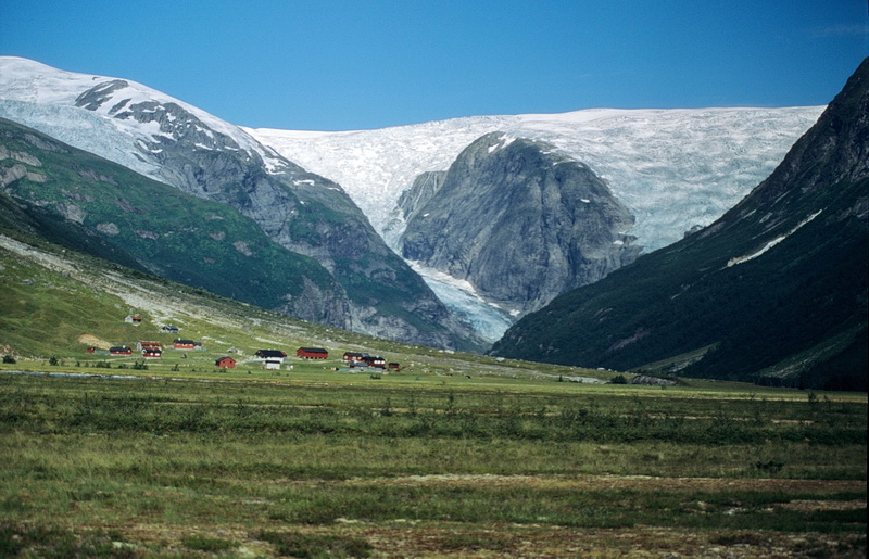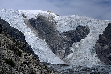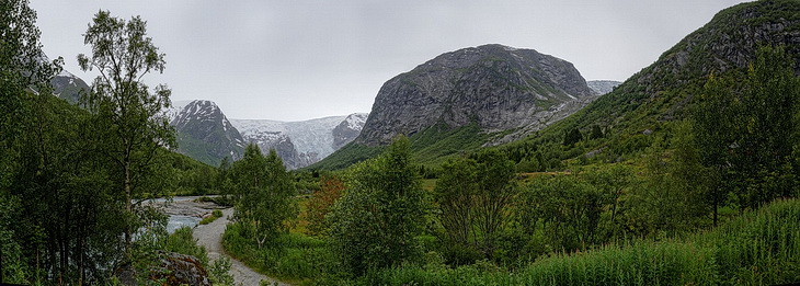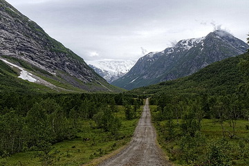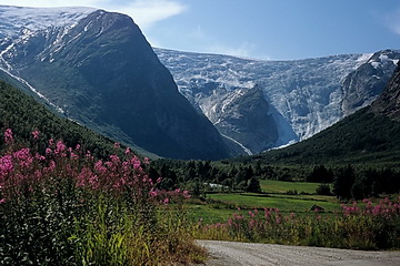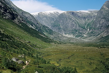 A small path across rock slabs leads from Tungestølen in eastern direction through the Austerdalen valley to the moraine of Austerdalsbreen which is formed by the ice falls of Odinsbreen and Thorsbreen.