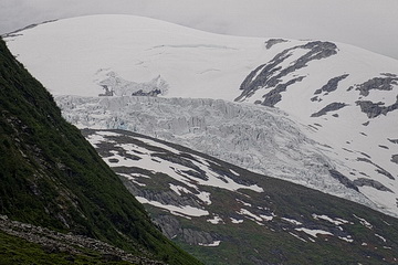 The ice fall of Bergsetbreen seen from the parking at the end of the road from Gjerde into the Krundalen valley.