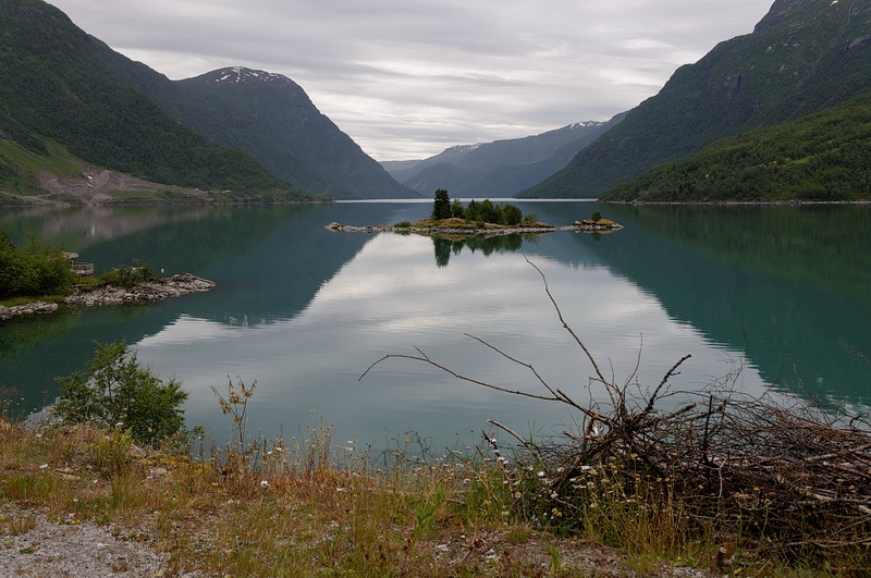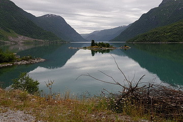 One thing one has to get used to is driving on the road along Veitastrondvatnet (13 miles), especially in situations like these. The traffic density is however very low and the are enough turnouts.