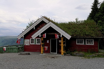 On the road to Vikafjell plateau the Storesvingen Fjellstove Café is the optimum place to enjoy the magnificent view down to Vikøyri and the Sognefjord. The white line in the center of the panorama is Kvinnefossen waterfall near the ferry port of Hella.