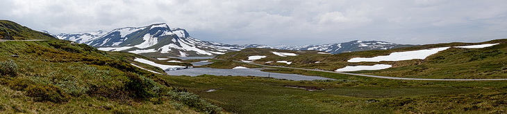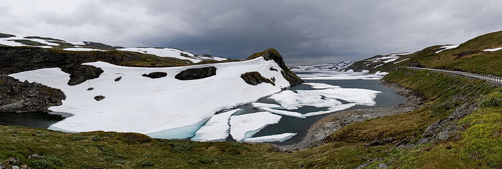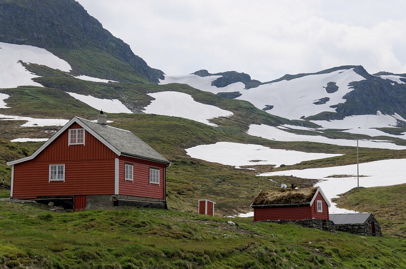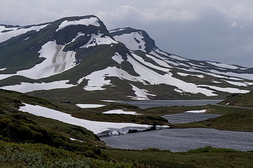 Danach wird es wieder winterlich. Die Straße über das Vikafjell führt hinauf auf etwa 1000 m und ist die einzige Landverbindung nach Vik, das bis zur Fertigstellung der Strasse 1957 nur mit dem Boot oder der Fähre zu erreichen war.