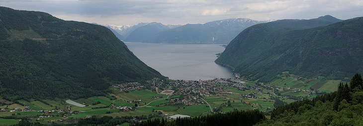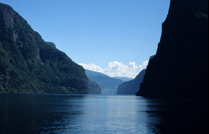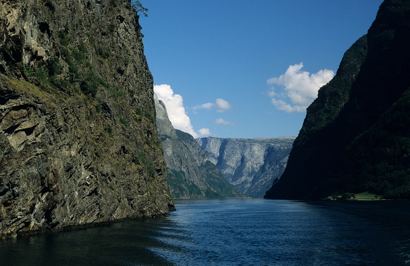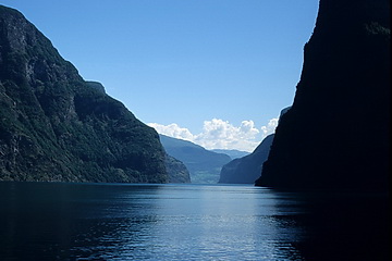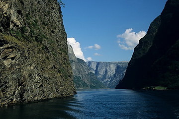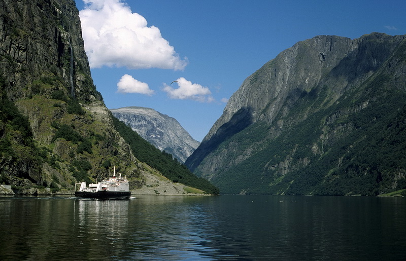 In der Bucht von Kaupanger am Sognefjord besteigt man die Fähre zu einer fast vierstündigen Überfahrt nach Gudvangen am Ende des Nærøyfjords. Der etwa 17 km lange, 500 m tiefe und an der schmalsten Stelle nur 250 m breite Nærøyfjord wurde benannt nach Njord, dem Gott der Seefahrer. Durch das Nærøydalen geht es 350 m hinauf zur Passhöhe von Stalheim, wo sich auch das 1885 gebaute Historische Stalheimshotel befindet. Schon 1647 gab es die erste Postverbindung von Oslo über die Stalheimskleiva nach Bergen.