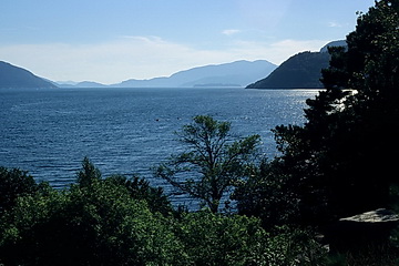 We crossed the Bergen railway at Voss and reached the Hardangerfjord 30 kms later. With a length of 179 km and a depth of 860 m it is Norway' s second largest fjord.