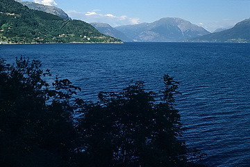 In Voss kreuzt die Strasse die Bergenbahn und nach weiteren 30 km erreicht man den Hardangerfjord. Mit 179 km Länge und einer Tiefe von 860 m ist er der zweitlängste Fjord Norwegens.