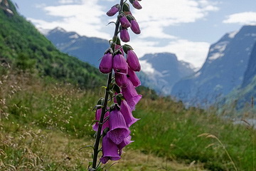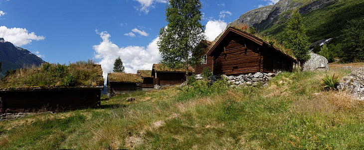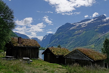 Eine Sehenswürdigkeit, die wir auf dem Hinweg einfach übersehen hatten sind die Almhütten von Breng direkt an der Straße entlang des Lovatnet. Ebenfalls am Ostende des Nordfjord liegt das parallel zum Kjenndalen verlaufende Oldedalen. Am Talende sind es vom Parkplatz an der Briksdalsbre Fjellstove noch ungefähr 150 Höhenmeter zum Gletscher, die man entweder zu Fuss oder in einem der zahlreichen 6-sitzigen trollbilars (Troll-Autos) bewältigt.