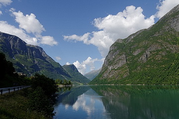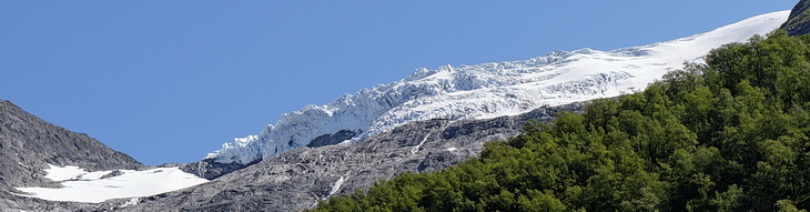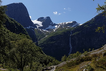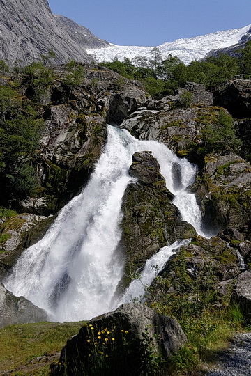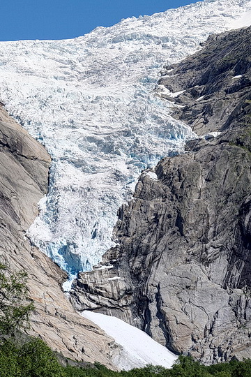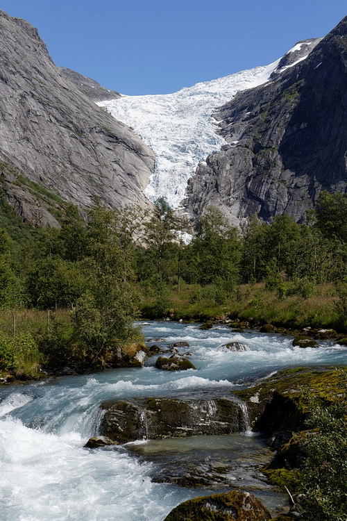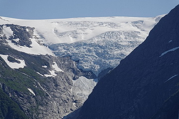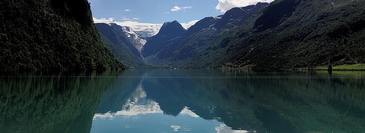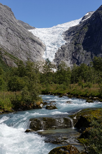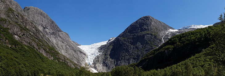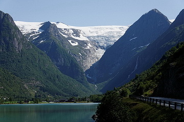 Der Briksdalsbreen ist bekannteste Gletscherabbruch des Jostedalsbreen mit mehreren hunderttausend Besuchern pro Jahr. Ähnlich wie zum Kjenndalsbreen fährt man auch hier zunächst an einem langen See, dem Oldevatnet entlang, von dem man einen herrlichen Blick auf den Melkevollbreen, einer weiteren Gletscherzunge des Jostedalsbreen hat. Den Briksdalsbreen erreicht man durch das von links (Osten) herunterziehende Seitental (linkes Bild).