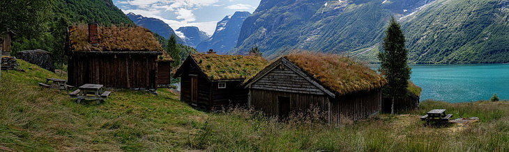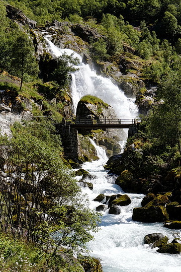 Über glatt geschliffene Felsen stürzt die Brengselva vom Skålabreen in den 1300 m tiefer gelegenen Lovatnet. Daneben steht eine Gruppe von Almhütten, die als eines der beliebtesten Fotomotive Norwegens beschrieben wird.