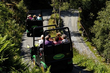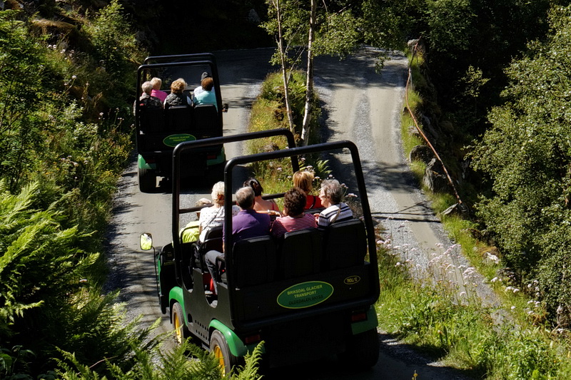 A place of interest we just missed on on the way to Kjenndalsbreen are the alpine huts of Breng on the road along the Lovatnet lake. Our next destination was Oledalen, another valley at the eastern end of Nordfjord. The road ends at the parking near Briksdalsbre Fjellstove below the famous glacier. The final 150 m of altitude can either be climbed on foot or by using one of the 6-seated trollbilars (troll cars).