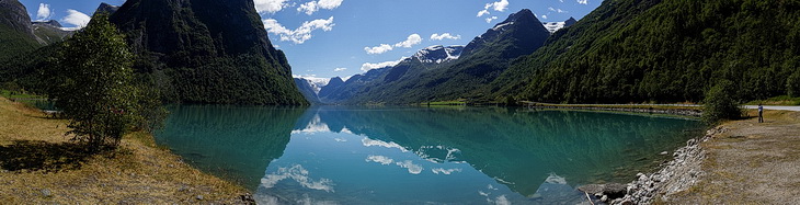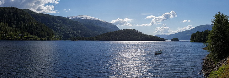 On the way back to Hornindal there are several nice places to stop and enjoy the stunning scenery. The final panorama is showing the islands of Bjørnaholmen and Abelholmen at the eastern end of Hornindalsvatnet. In the background Gliteregga (1.297 m) which has a small glacier on its northern side.