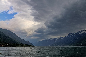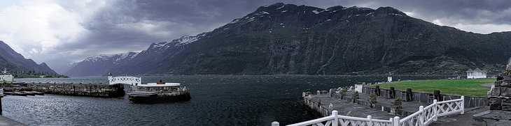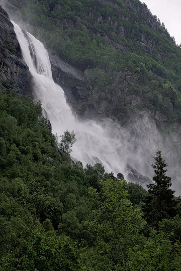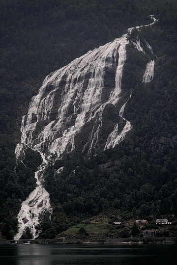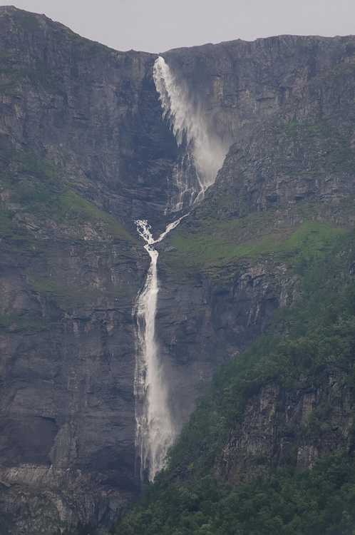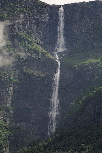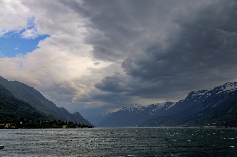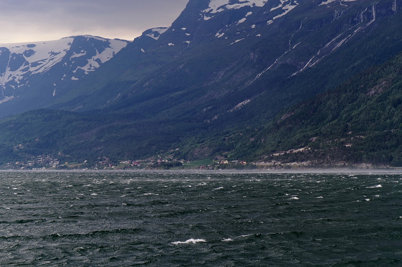 From the hotel we were able to follow the formation of the upcoming storm. Skrikjofossen, a waterfall 900 meters above, was indicating the storm which started blowing at higher altititudes and slowly made its way down to fjord level.
