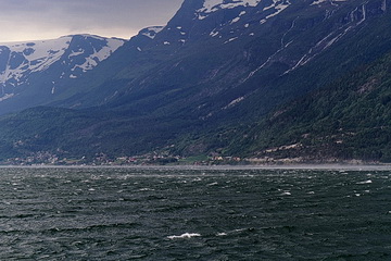 Vom Hotel aus ließ sich die Entwicklung des aufkommenden Föhnsturms gut mitverfolgen. Der Wasserfall Skrikjofossen 900 m über dem Fjord zeigt an, wie sich der Föhnsturm zuerst in der Höhe und später bis zum Boden durchsetzt.