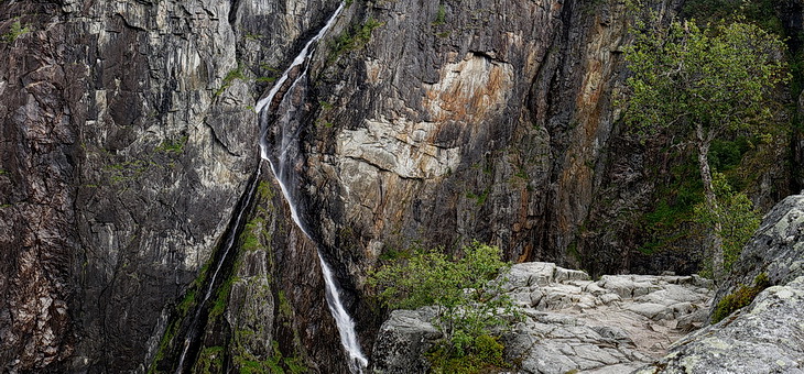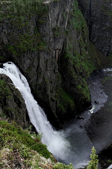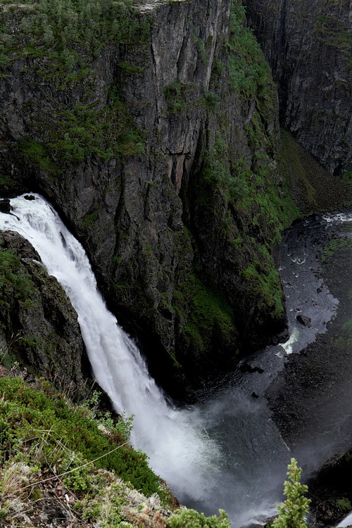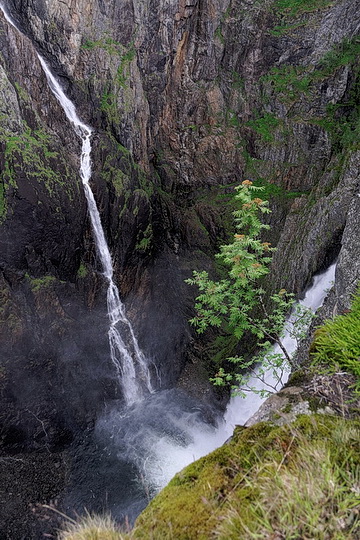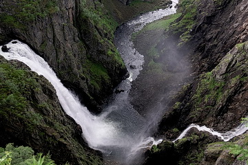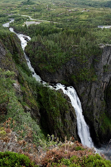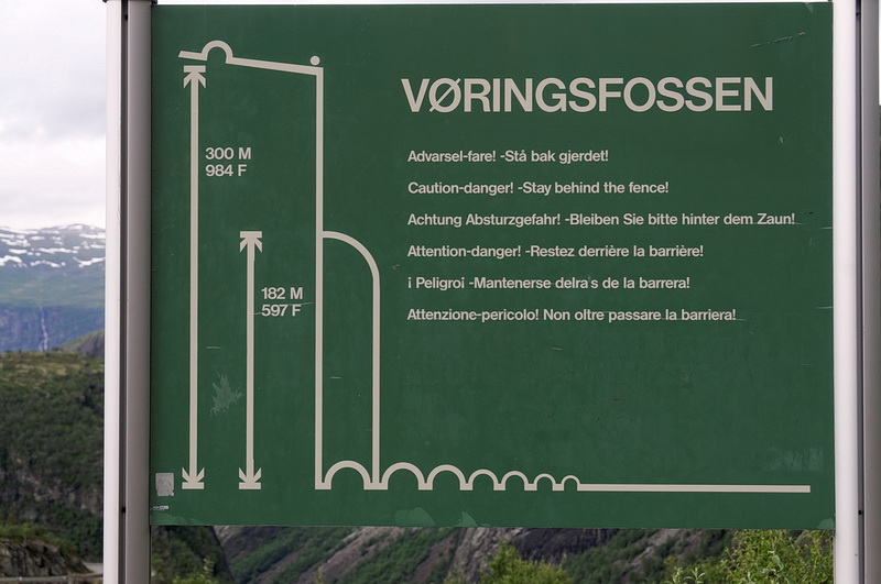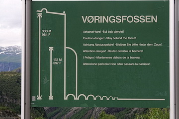 Von einem Parkplatz direkt an der Straße führt ein Weg zu einem Felsvorsprung oberhalb des Wasserfalls (linkes oberes Bild), mit eindrucksvollen Tiefblicken in die Schlucht des Bjoreio Flusses. Vom Vøringsfossen selbst sieht man allerdings wenig. Warnschilder mahnen zur Vorsicht, nur am Aussichtspunkt selbst ist ein Geländer angebracht.