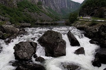 Der Ædnafossen am gegenüberliegenden Ufer und der Tjøndalsfossen direkt an der Straße nach Odda.