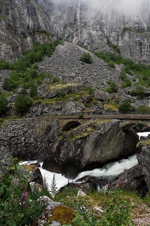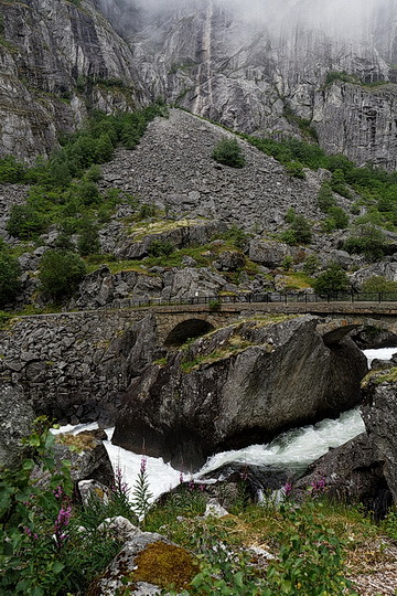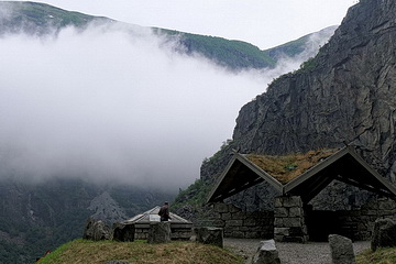 The viewing platform near the Fossli Hotel is offering the best view of Vøringsfossen (182 m). As the water of the river Bjoreio is partly diverted for hydroelectric purposes the amount of 12 cubic meters per second is only guaranteed during the summer months.