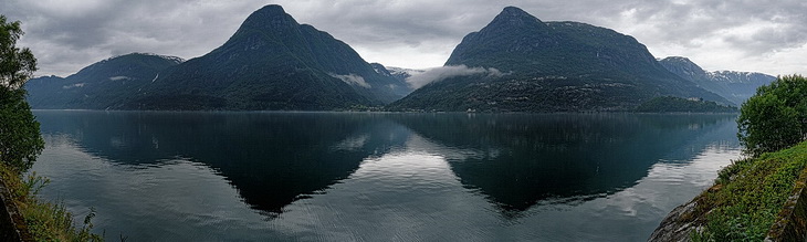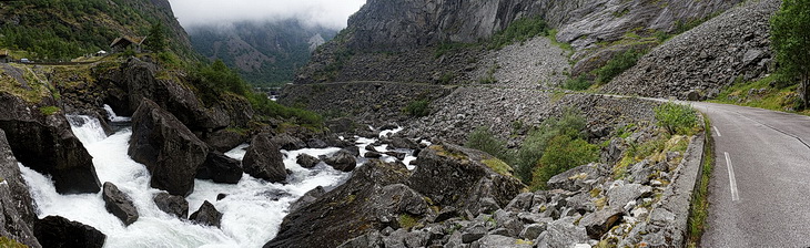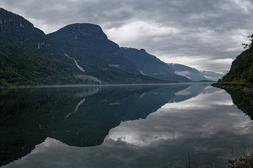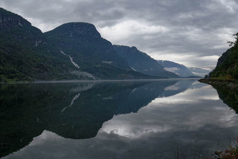 The left picture below shows Sandevatnet lake where a layer of mist was spreading above the water which was caused by the cold melting water of Buerbreen, a part of the Folgefonna glacier.