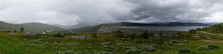 The altitude of Sysenvatn is specified with 940 to 874 m depending on the filling level of the lake which is supplying one of the largest hydro-electric power plants in Europe. The dam with a length of 1.160 meters consists of 3.6 million cubic meters of stones and gravel and is damming the waters of Hardangerjøkulen as well as the river Bjoreio which is diverted partly for this purpose.