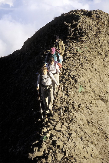 Bei schönstem Wetter begannen wir dann den Aufstieg zum immer noch 1000 Höhenmeter entfernten Gipfel des Meru. Der Weg führt in einem großen Bogen immer am Kraterrand entlang wobei der unangenehme Lavaschutt und die zunehmend dünner werdende Luft uns nun doch etwas zu schaffen machten.