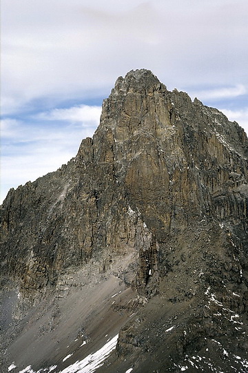 Blick zurück auf Batian, Nelion und die Felsnadel der Pt. John, im Hintergrund die Point Lenana.